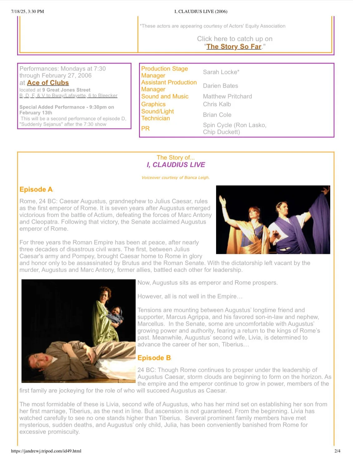 My co-artistic director and I would be in tech for the first installment, rehearsing for the second and third, casting the fourth, and finalizing the script for the fifth and sixth. All while holding down full-time jobs. It was madness. The breakthrough came when we realized that our characters could exist simultaneously in the time of Augustus and in the time of Trump (who was still just a reality show host at that time), We encouraged our actors to ad lib topical jokes, to interact with the audience, to go “off script” as an act of resistance. We wanted to wake our audiences up with a blast of anarchic positivity, not put them to sleep with a PhD dissertation defense.